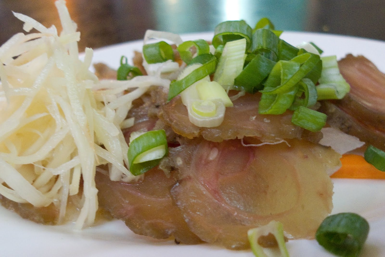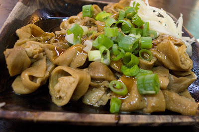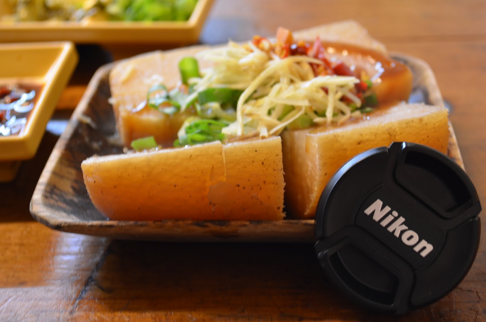 NT 50 魯蘿蔔放在牛肉湯中滷,搭配薑絲與辣油很適合當下酒菜。每次來必點,但是目前這個季節不太適合點這道菜,因為蘿蔔的甘甜度不夠,而且筋變多...不過店家似乎有挑過,所以吃到筋的機會變小一些。拿鏡頭蓋來當比例尺。