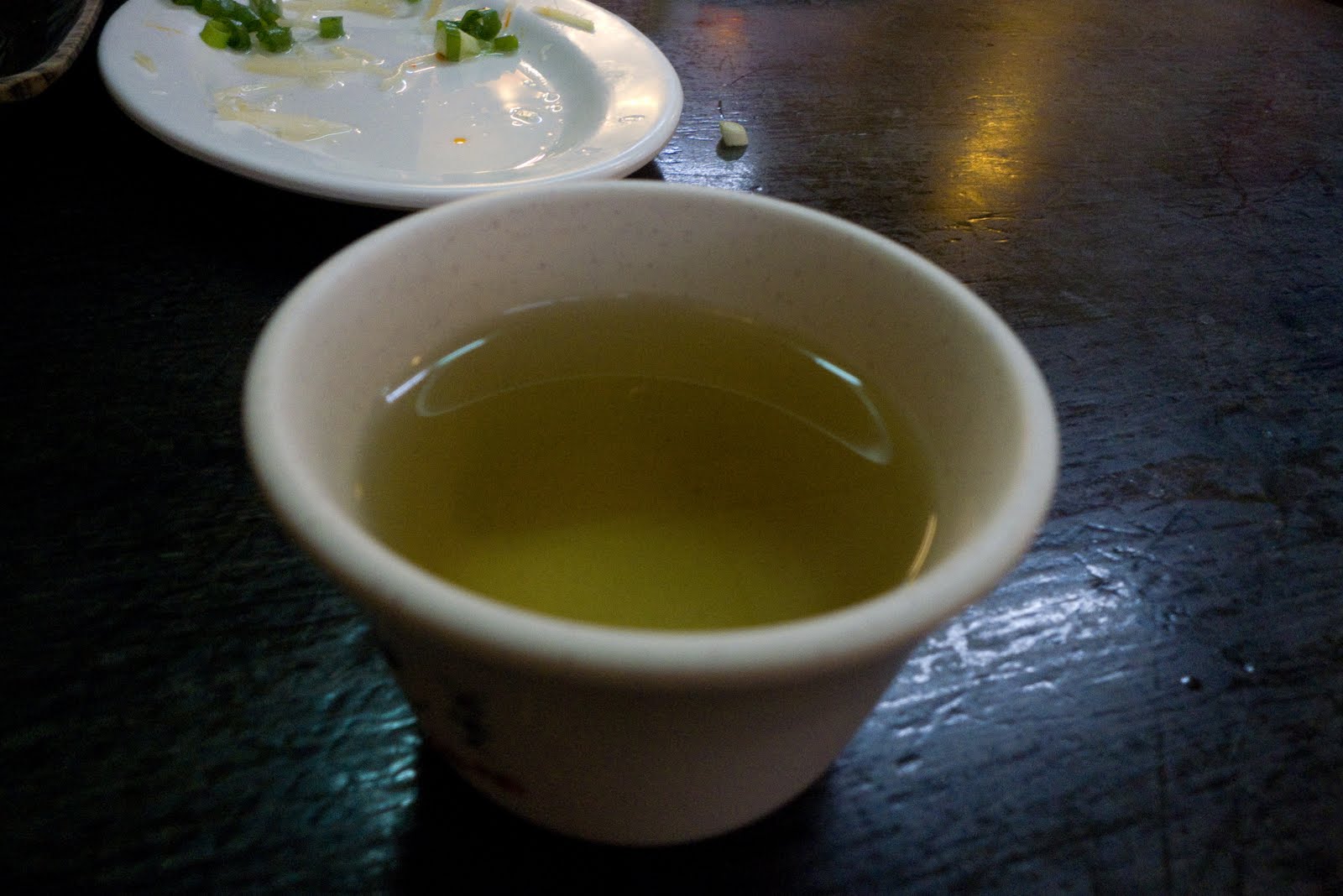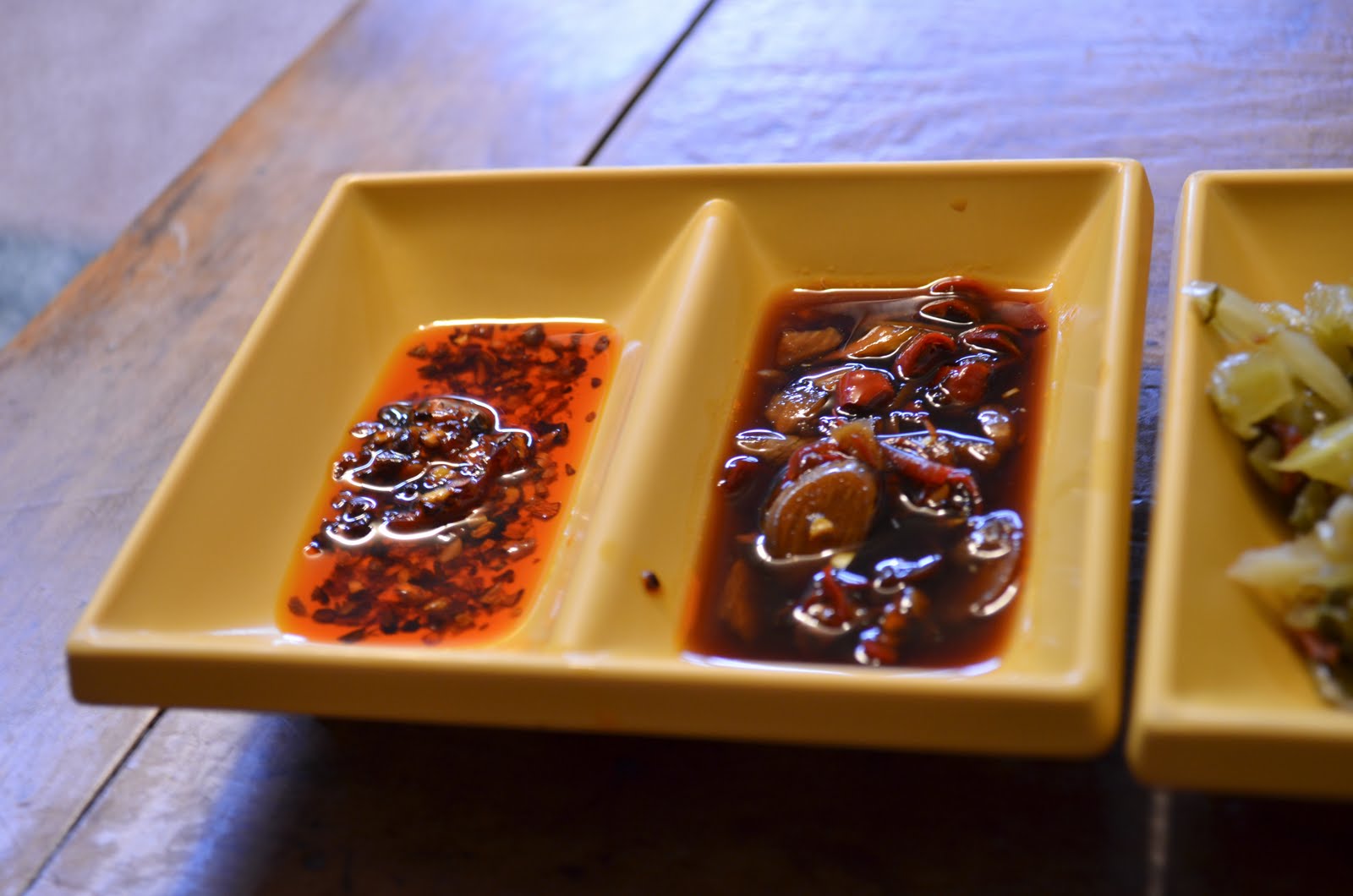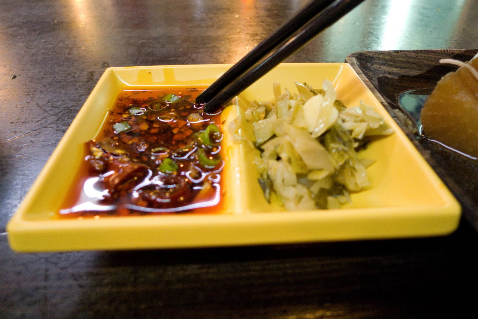 依個人口味辣油、辣醬油、蔥自由混合,右邊的酸菜也是自取,酸度剛好也不會太鹹。