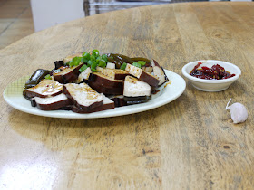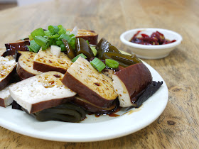 右上辣椒醬油調得頗好吃,夾一點醬油裡的辣椒加在豆干上,口感層次向上提升。