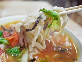 為什麼麵裡面只有三塊牛肉就要賣一百元? 麵一上桌,我就先聞碗面,沒辦法~這是喝咖啡喝久之後的習慣(聳肩) 聞碗面只有鹹香的牛肉湯味,沒有其它雜味,湯上沒有什麼浮油,只有微微的辣豆瓣醬零星浮油,湯底竟然沒有混濁,喝起來有牛肉的味道。老闆的手工麵就是為了這碗牛肉麵而存在的,麵很有彈性、咬勁,一整個和湯汁很搭,吃蕃茄肉絲麵總覺得有點不搭,吃到這碗牛肉麵時突然就頓悟。