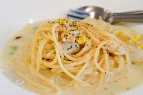 NT100 奶油鮮採蔬菜,裡頭有冷凍的玉米和青豆,讓我覺得嚐起來像是玉米奶油濃湯口味的義麵,杏鮑菇厚薄程度不一,有吃到大部份0.2cm厚的菇也有吃到一塊類正方體2cm厚的菇,所幸都有熟。麵有一定的水準,吃起來不會軟趴趴,而是有嚼勁。