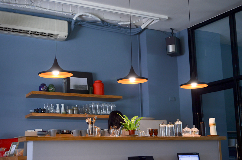 吧台,牆是淡藍色的,但因為室內照明較弱,所以牆面看起來像深藍。天花板全漆成白色,很適合打跳燈拍照,看得出來店家的用心。