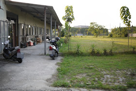 客人的機車停在轉角水泥地上,左前方是入口。草皮看起來很好躺。