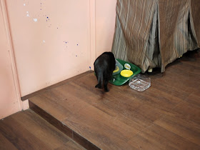 黑貓---宅急便,沒人看他送過貨就是了,今天宅大人不舒服,被套上頭套,防止牠抓自己的傷口。我摸宅大人的頭,牠乖乖讓我摸,很穩定的店貓,但是牠今天真的很憂鬱,一直在店走來走去、看著玻璃門外,想出去走走。