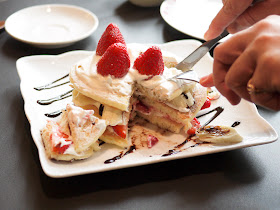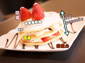 這是吃了會讓人眼睛一亮的甜點,鬆軟的Pancake裡頭夾著豐富的配料,一個女孩當正餐吃的飽,當下午茶配杯英式紅茶也很棒,也非常適合幾個女孩一起分享,Pancake的綿密口感、草莓的酸、香蕉的甜、巧克力的苦,形成多層次的口感,吃一口就會愛上的好滋味,很慶幸以後再也不用跑台北,在桃園就可以吃到這麼優質的甜點,超幸福的。