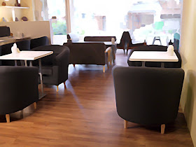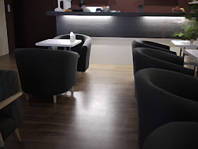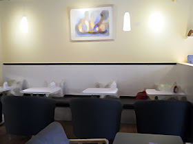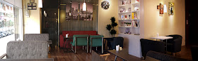 進門左手邊,有一大片落地玻璃窗,採光非常棒,很多人喜歡坐窗邊喝咖啡、吃下午茶,紅配綠大膽用色的沙發椅、玻璃牆上黑流蘇、城市夜景圖,看起來很有特色,白色那櫃有雜誌可以翻閱,最邊邊那個門是廁所。