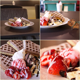 四片 Waffle 灑上糖霜、當天市場採買的新鮮草莓與香蕉,淋上煉乳、草莓醬、巧克力醬,中間是當日現打的綿密香緹鮮奶油,挖兩球進口草莓冰淇淋及巧克力冰淇淋佐杏仁片,光看就覺得很好吃,所以我請店長借我拍照,有個記錄打算下次找朋友來吃。