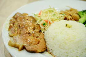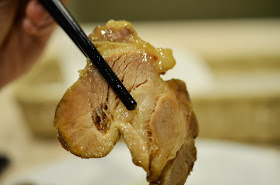 挾了一片入口,讓蜜汁肉在口中翻動,這口感....軟嫩又帶有豬肉的甜香,醬汁濃稠卻不膩,好有深度的媽媽味,根本就不是白豬肉抹醬這麼膚淺,豬肉有特別選過,肥瘦比例剛好,忍不住想說一聲 : 這是塊好叉燒!! 後來主廚(就是老闆的媽媽) 出來關心我吃的如何,畢竟我晚上加班,8點半才吃到晚餐,是店裡最後一位點餐客人,主廚有空檔可以出來休息跟我聊食物,她跟我說她以前有從事拉麵店的工作,難怪...蜜汁肉這麼好吃!!