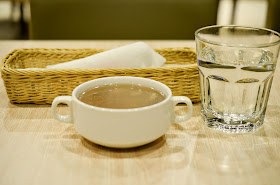 幾乎都是料的素食四神湯,薏仁、牛蒡、蓮子、腰果,完全沒有加味精,這幾種食材讓四神湯變得很清甜,跟我在家裡喝的養生排骨湯味道好像,只是我家用料沒有這麼精緻。