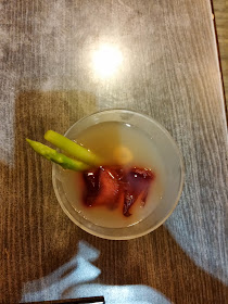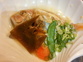 清酒赤宗(又稱赤鯮或小鯛魚),俗諺:一鯃、二紅鯊、三鯧、四馬加、五鮸、六嘉、七赤鯮、八馬頭、九烏喉、十春子,這幾種魚是高級魚種,我在井味屋就吃過好幾種了,巴掌大小的赤宗加入清酒、水和味醂調味一下,沒有過多的調味,魚肉緊實而鮮甜。