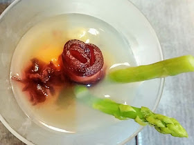 夏日菜單第一道出的是冰冰涼涼的洛神花茶凍,一人一個,洛神花是植物界的紅寶石,養顏美容又解熱、促進食欲,裡頭有吸飽洛神花醬汁的蘋果切片、洛神花萼及當季水果切丁。
