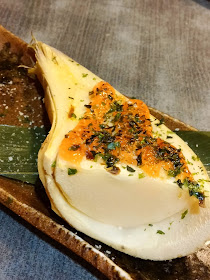 第二道是焗烤鮮竹筍,一人一支,這是烤烤明太子鮮竹筍要 1600的套餐才會附,因為是店家配菜,所以老顧客有的菜色會抽掉,然後昇級菜色,基本上 1人800元套餐是焗烤鮮竹筍。做法和一般用水去煮軟不同,店家用的是生米水+秘密把竹筍煮軟,舖上乳酪絲等焗烤材料進烤箱烤,最後灑上海苔粉,除了保留竹筍的細緻口感,還有一股溫潤的水梨甜味,再加上鹹甜的明太子沙拉焗烤,海洋的鮮味和竹筍的清脆甜合而為一。老少咸宜的一道討喜菜色。