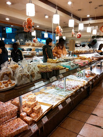 店裡一堆人,店家會放一些試吃在商品旁讓大家試吃。