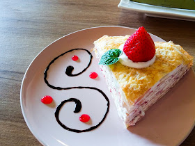 本來我怕他太甜,但是實際上吃起來不會太甜,乾淨的乳香、蛋香和微酸的草莓讓人一口接一口,吃起來也不會太乾,鮮奶油和草莓的汁液讓整塊千層都很滑口。