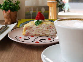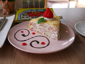 好大一塊的千層派啊,大約是兩塊多 85度C長方型蛋糕的份量,兩個女生分食也OK,派皮原料大概是蛋、牛奶、糖、奶油、低筋麵粉再用平底鍋煎出金黃色澤,看起來就很費工。