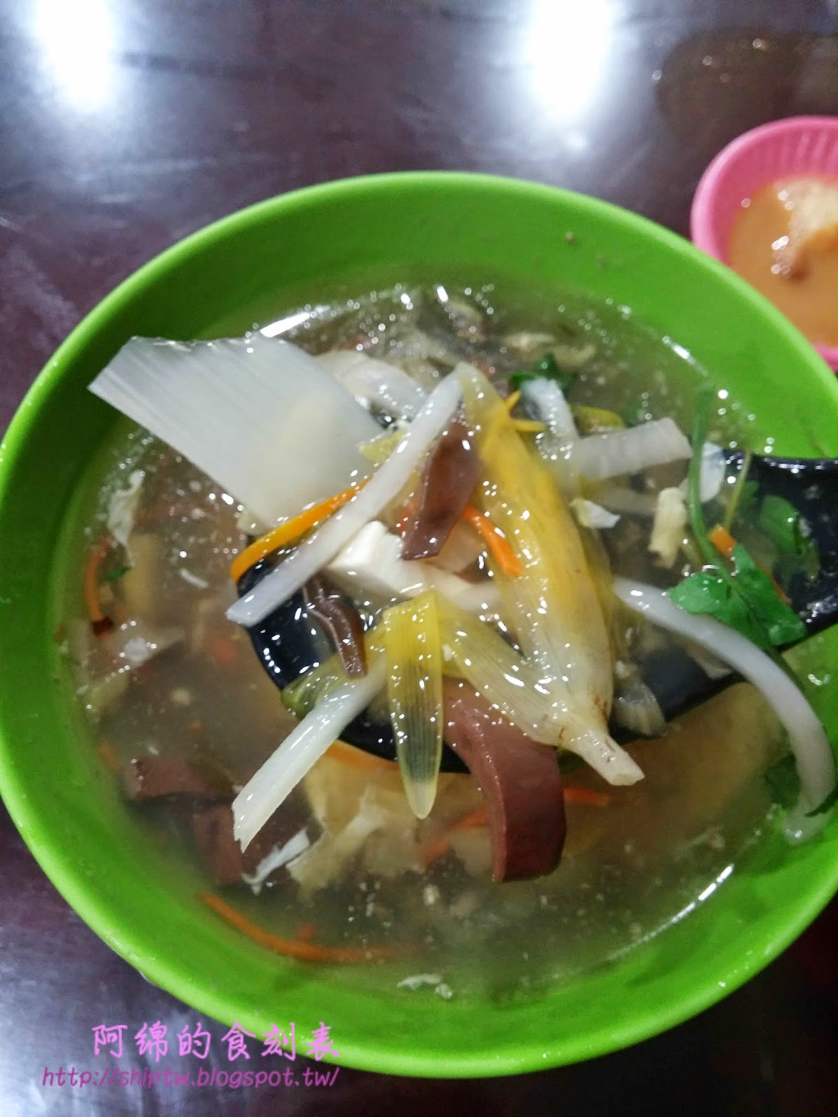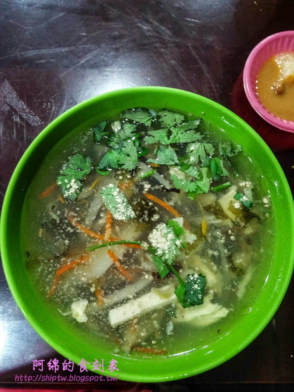 用湯匙舀一匙,發現裡頭料還蠻多的,有筍片、酸菜、金針花、黑木耳、香菜、紅蘿蔔絲、豬血、豆腐和一點蛋花。味道蠻天然的,是用金針花、筍片和酸菜等天然食材把酸味提出來,辣的部份就是由白胡椒粉做提味,整碗湯並不會太酸太辣。酸辣湯裡沒有肉絲,吃起來好像少了什麼。整體來說酸辣湯口味偏淡一些,但是料好實在。
