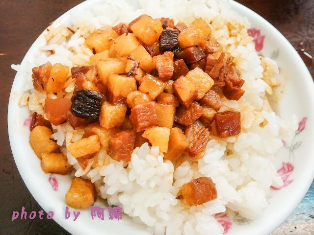 口味算微甜的魯肉飯,確定是黑豬肉,因為在飯的上面有撿到一根短短粗粗黑毛,我把毛挑掉繼續吃...怕肥怕油的人不要吃這道,如你所見,上頭全是肥丁,瘦肉很少很少,也沒有任何解膩小菜,可以吃得出來是每天現做的魯肉,但是魯的時間不夠久,只有外層上色,深層並沒有很入味,魯肥丁口感很Q彈,仔細咀嚼有炸豬油的味道,魯肥丁和白米飯一起吃還可以,但不是我的愛,我愛霸王豬腳那鍋 24小時北魯,魯到脂肪都溶到魯汁裡,舀一匙魯汁加到白飯上再灑上蔥蒜,白飯和魯汁、滑嫩魯肉一起滑到肚子裡。