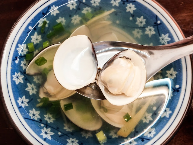 用的是大顆的蛤蜊,你看蛤蜊平躺在湯匙上囂張的模樣,我不喜歡這種大蛤蜊,肉多、貝柱大,但是沒有什麼蛤蜊味。