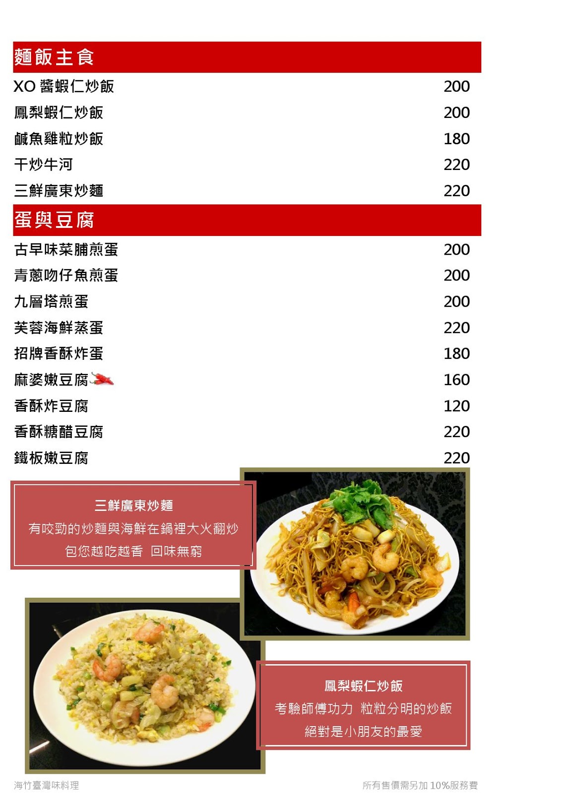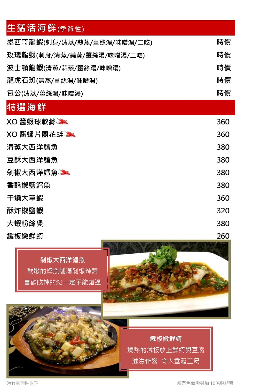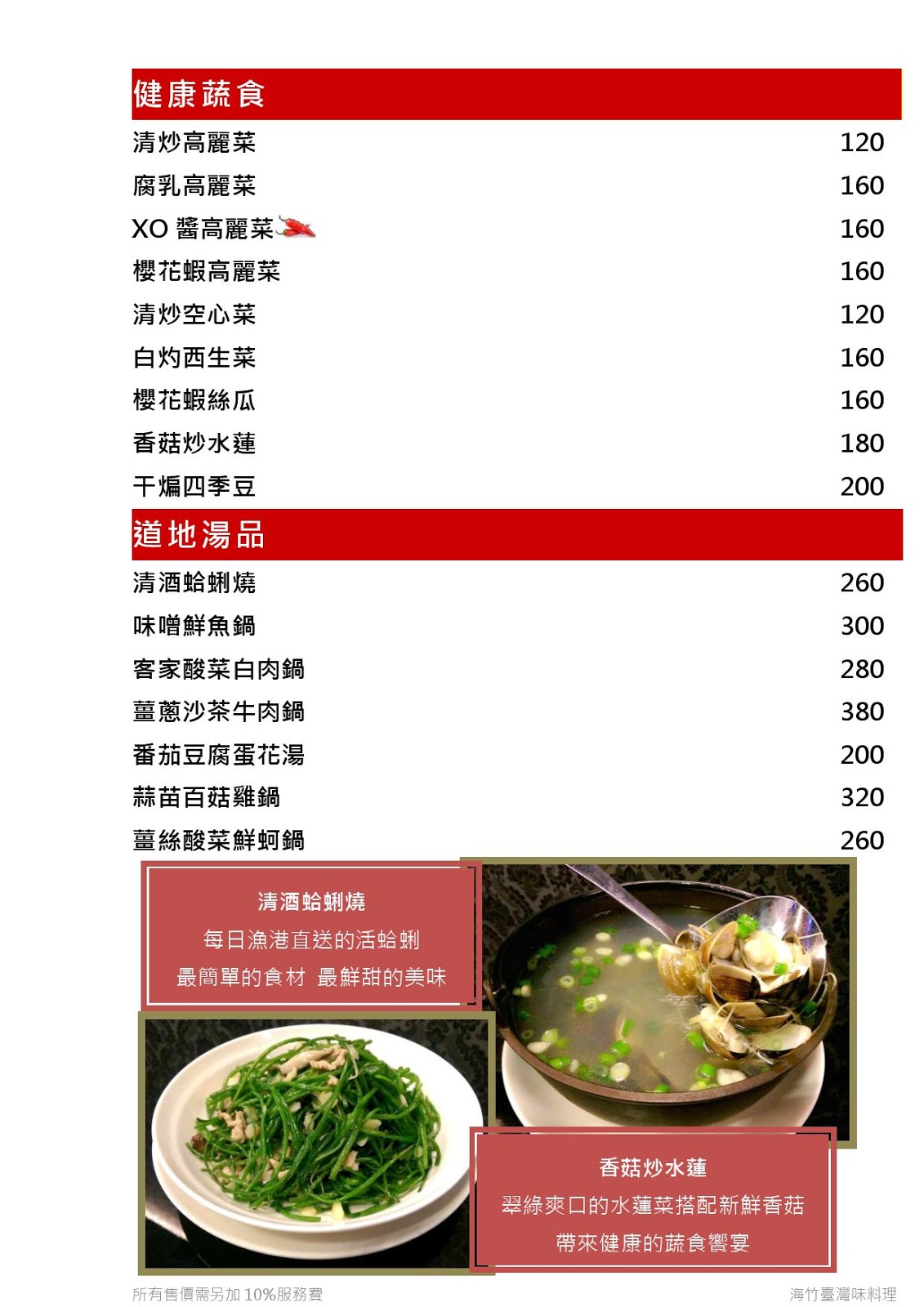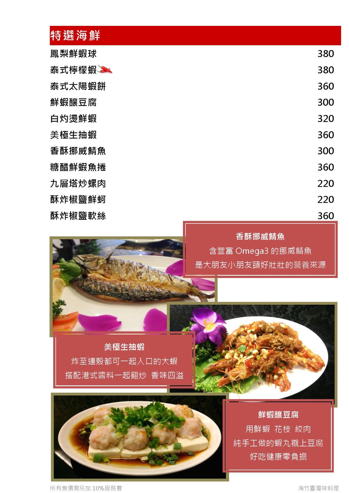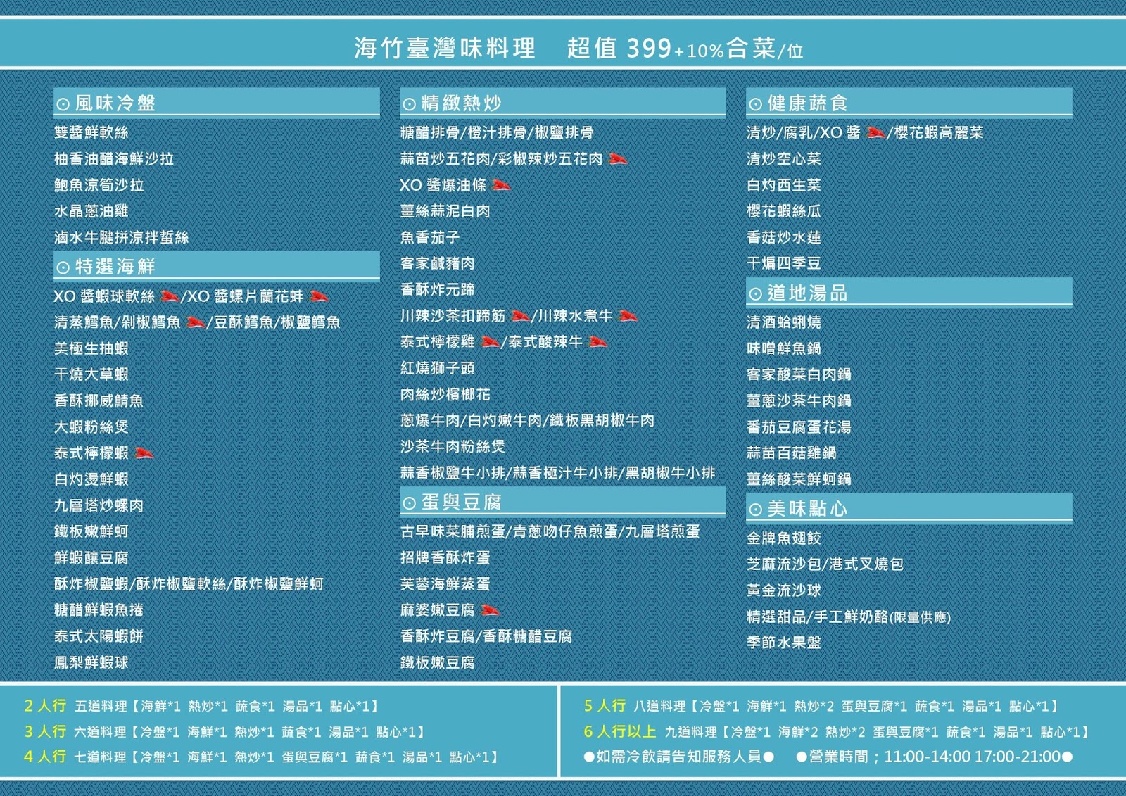 ▼我們點「海竹臺灣味餐廳」超值399+1成/每位的2人行套餐,最底下是可選擇的項目和道數,2人行套餐內容 : 海鮮*1、熱炒*1、蔬食*1、湯品*1、甜點*1共 5道,只看字面看起來還好,但是實際品嚐後,菜色精緻,份量也夠,結論是吃巧又吃飽。光看菜單開出來的菜色就知道廚師來頭不小,廚師是中壢老牌知名餐館出來的,他的調味和料理手法,我們很習慣也很喜歡。