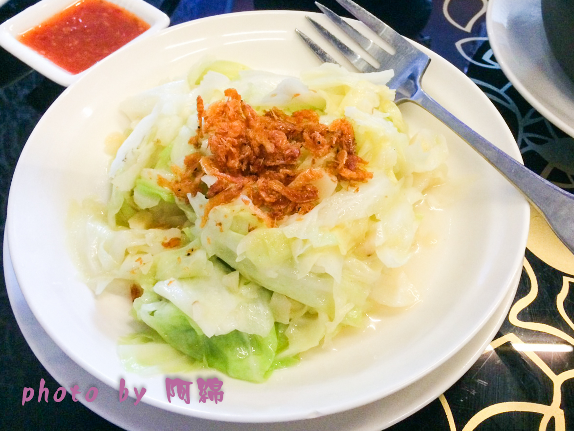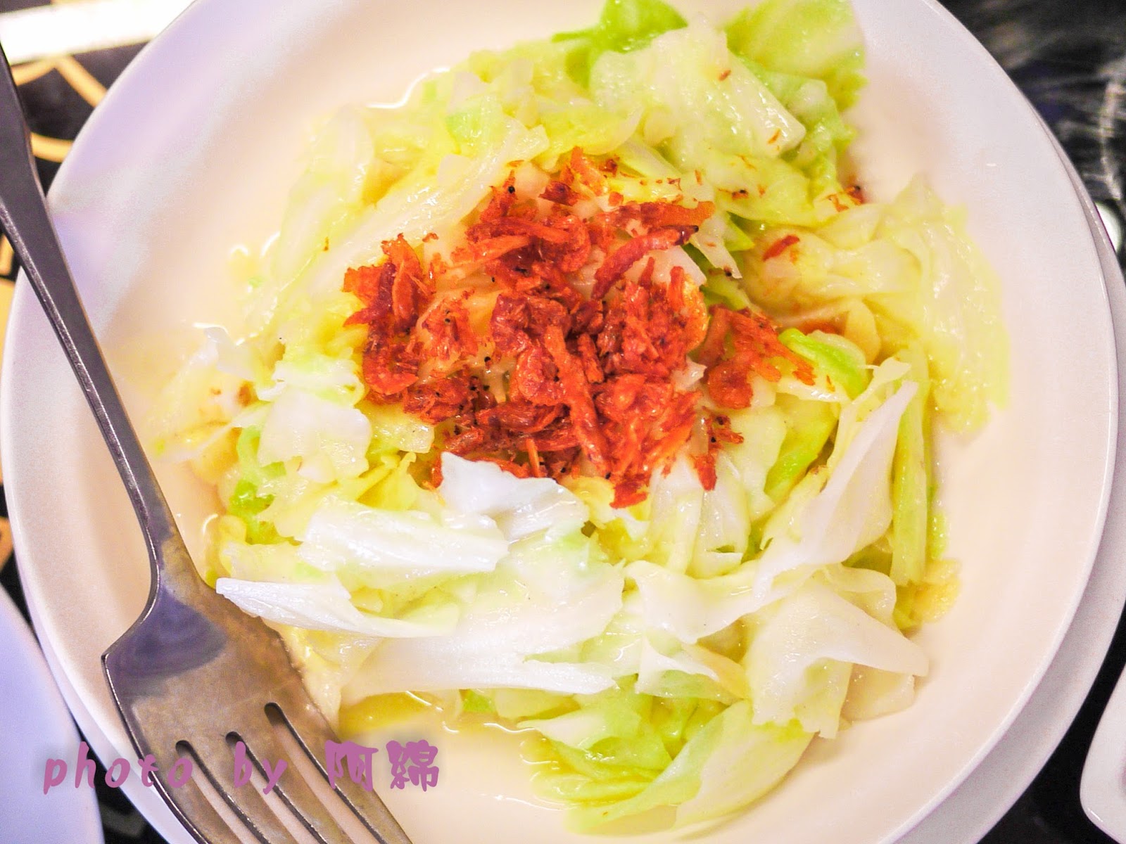 櫻花蝦和油爆炒後瀝乾,用櫻花蝦油去炒高麗菜,最後再把櫻花蝦放到高麗菜上呈盤,每一口都有濃濃的櫻花蝦香氣,口感部份,師傅真的很會炒高麗菜,炒得不會太軟也不會太硬,是我們喜歡的口感。