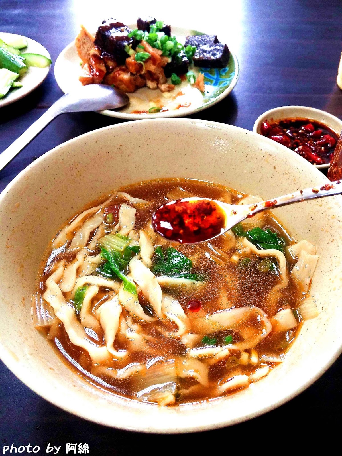 這是一位愛吃鬼大哥教我的吃法,行家一出手就知有沒有,原本欠缺厚度的牛肉湯因為加入蒜泥變得濃郁,再加入白醋、辣油調出自己喜歡的味道,酸菜可加、可不加,因為調整湯頭後沒有加分的效果,「小木屋麵館」的湯頭真的很棒,我把湯全部喝光光,瞬間肥度上升,唉...