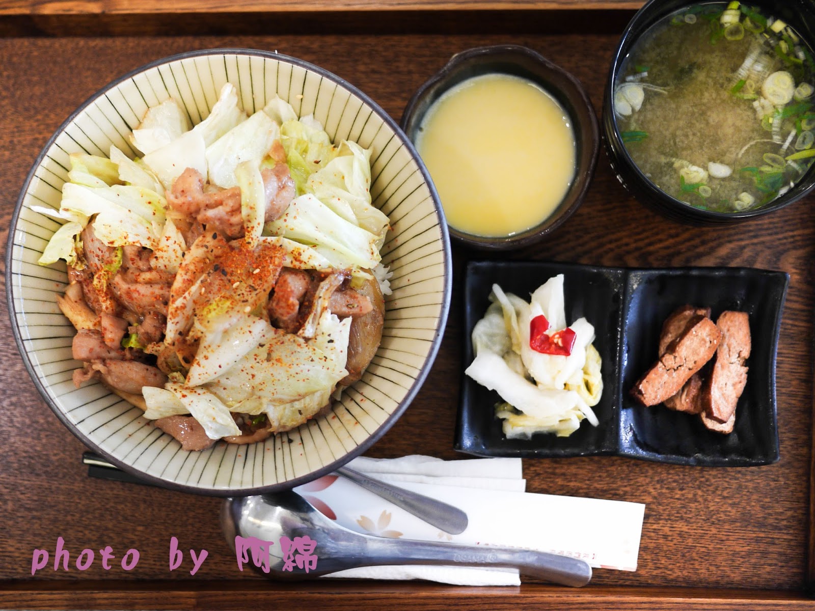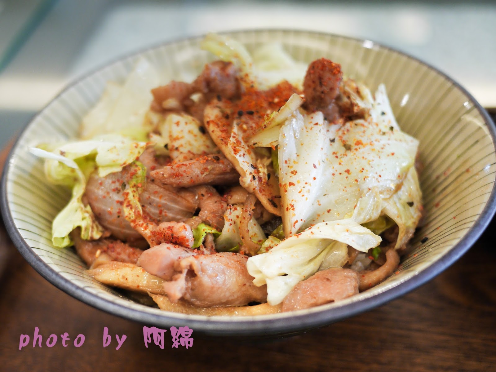 主要材料有 : 高麗菜、洋蔥、綠竹筍、雞腿塊,調味是店家機密,洋蔥、綠竹筍及雞腿塊仔細翻炒後照燒醬全都滲入食材中,滋味樸實而耐人尋味,而高麗菜則是另外清炒,吃起來脆口不軟爛,最後上桌時才灑上七味粉提香氣,整碗吃下來不會感覺油膩,這是碗適合夏天、男生女生都會喜歡的丼飯,蔬菜量和肉量都蠻多的,覺得吃不飽還可以加飯。