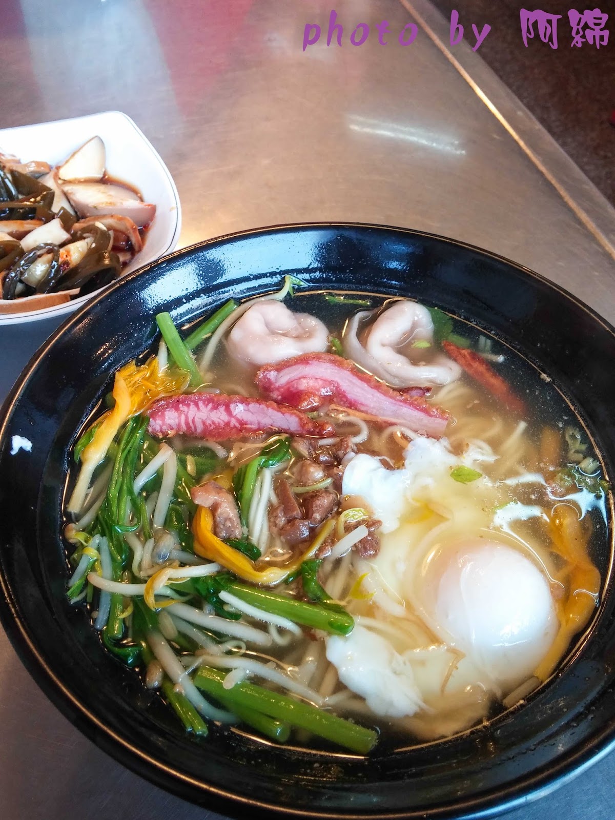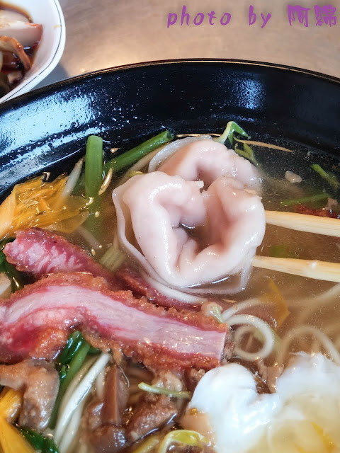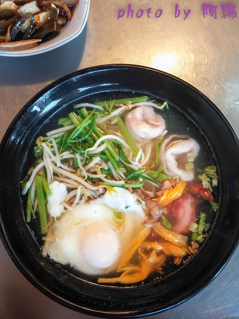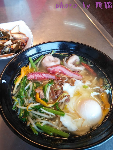 雖然沒什麼美感,像是雜菜麵,但是不得不說店家非常有誠意,光青菜就放了三種還附一點點魯肉、紅槽肉、魚餃和蛋包。