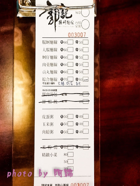 ▼菜單,似乎有三樣東西目前店家沒有賣,沒關係,我是專程來吃麵線的,第一次到新店家,我通常會點招牌或是綜合,今天也不例外,點了小碗綜合麵線,可以任選3種料,但要怎麼選料?有點難倒我了...是在大腸、蚵仔、肉羹、貢丸前打勾、打叉還是畫圈? 最後我在綜合麵線下面寫上大腸、蚵仔和貢丸(請忽略我醜醜的字)。